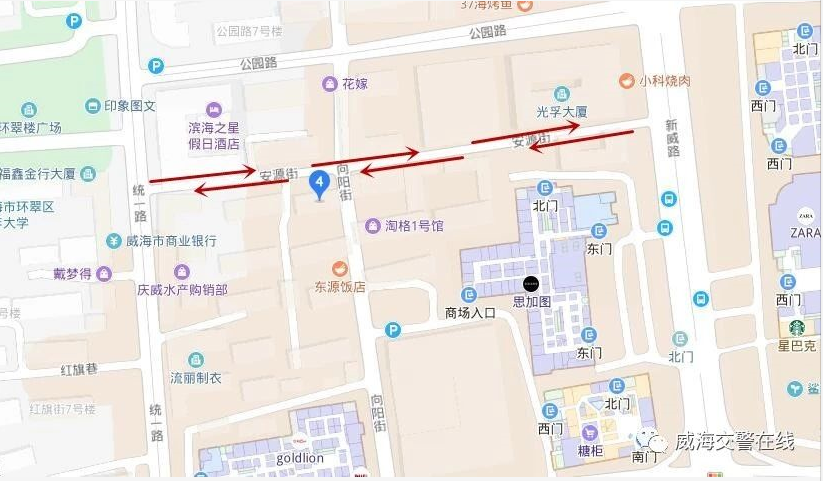 威海市区公园路将于近期进行封闭施工,为保障安源街周边单位、居民的交通出行方便,保证新威路与统一路的有效连通,根据《中华人民共和国道路交通安全法》的相关规定,决定自2019年3月29日起,调整安源街交通管理措施: